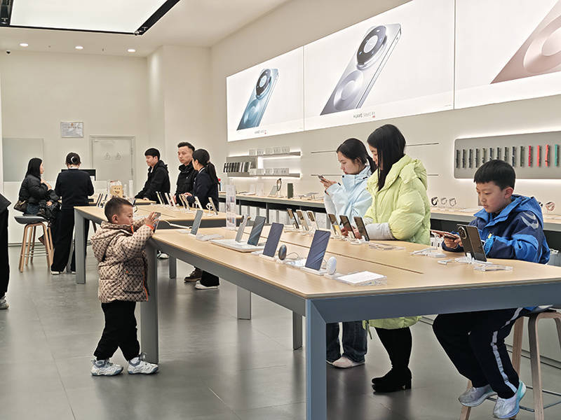 在仁怀市华为授权体验店(阿玛尼天街),傍晚时分的门店内人头攒动,手机、平板、笔记本电脑等数码产品陈列区前,咨询、体验、选购的消费者络绎不绝。“之前看中一款平板,原价2300多元,一直没舍得买,现在国补加上门店优惠,省了几百块钱,1000多元就到手了,特别划算。”市民杨秋莉拿着刚激活的新平板,脸上满是笑意。高端机型陈列区,市民胡彪正仔细检查刚购买的Mate70Pro,这款此前标价6000余元的手机,在500元国补与600元店补的双重加持下,最终以5000余元成交。“政策太给力了,优惠力度超出预期,这是开年收到的最大惊喜。”胡彪说。