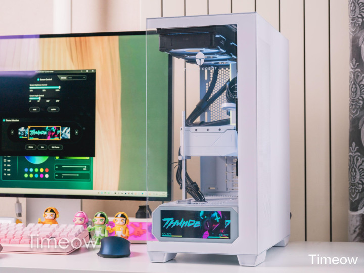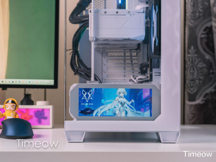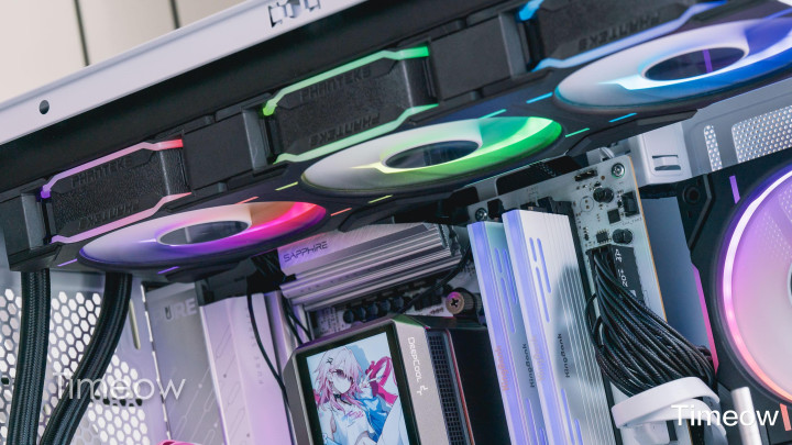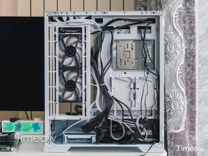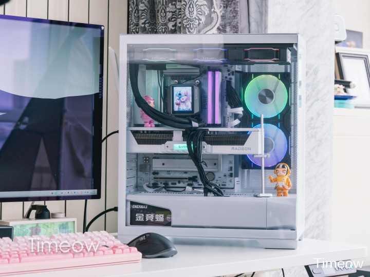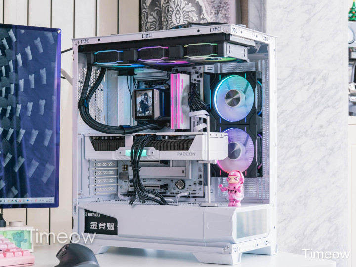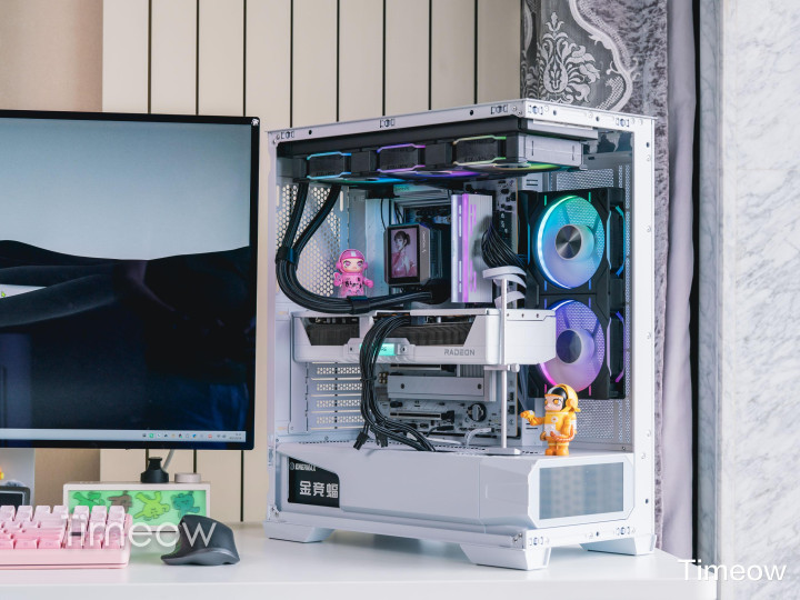 这外观真没的说——全透侧玻璃+白色金属框架,装完机从侧面看,显卡、水冷、内存、风扇的灯效一目了然,视觉效果非常突出。