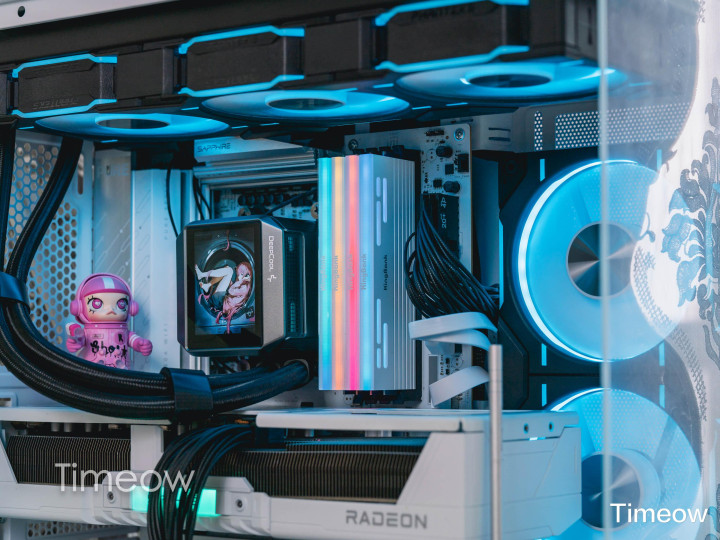 全白金属马甲+镂空RGB灯条,跟主板、机箱一配,开机瞬间灯效同步,视觉效果一流、还不刺眼。
